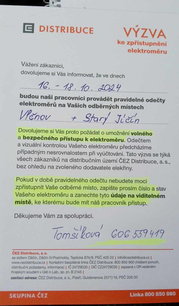 ČEZ - odečet elektroměrů Starý Jičín a Vlčnov