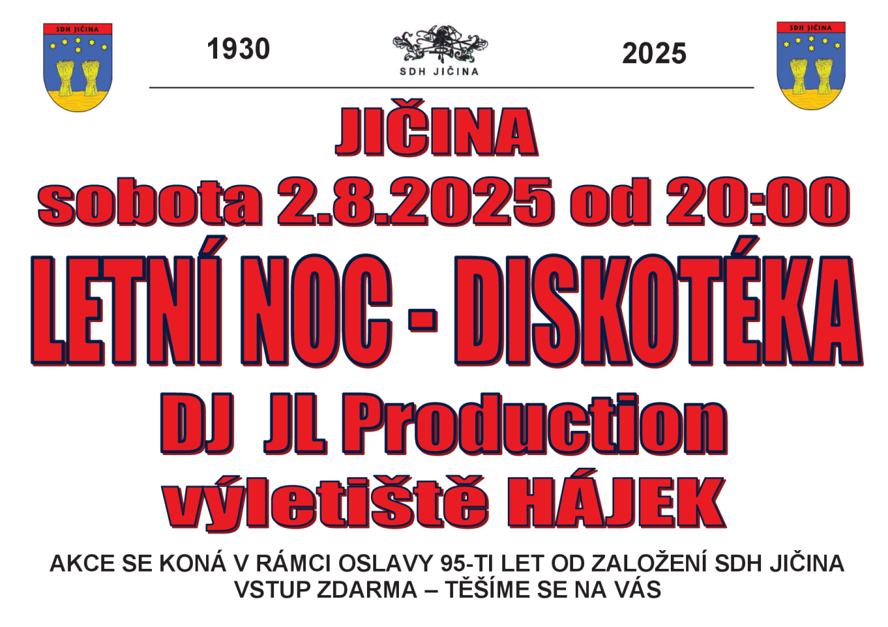 - V sobotu 2. srpna od 20 hodin jste srdečně zváni na letní diskotéku s DJ JL Production na výletišti na Hájku na Jičině, která se koná u příležitosti 95. výročí založení SDH Jičina. Vstup je zdarma a dobré občerstvení samozřejmostí. Přijďte si na Jičinu zatančit, posedět a strávit příjemný večer. Těšíme se na vás.