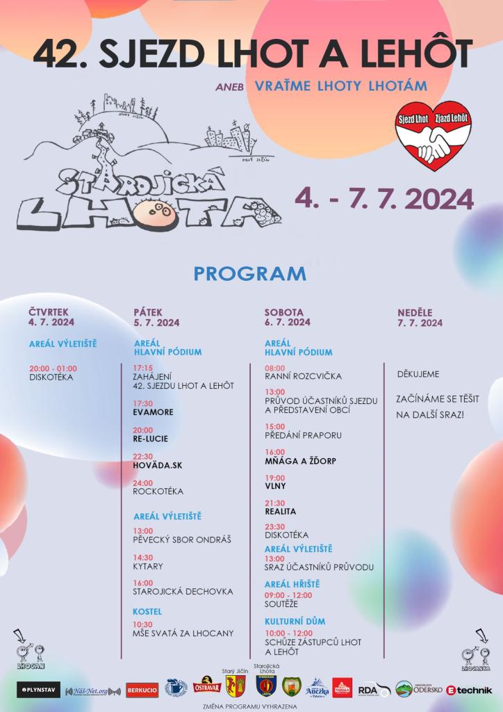 - Vážení spoluobčané, dovolujeme si vás pozvat na 42. ročník Sjezdu Lhot a Lehot, který se letos koná ve Starojické Lhotě od 4. do 7. července. Návštěvníky čeká pestrý kulturní program, který začíná ve čtvrtek 4. července od 20 hodin diskotékou na výletišti u Kulturního domu. Během pátečního programu se můžete těšit například na Dechovou hudbu Starojičané či vystoupení lhotských kytaristů na výletišti, kde je program přístupný zdarma. V hlavní areálu u hřbitova se pak uskuteční široká škála koncertů v čele se skupinou ReLucie. V sobotu pak mimo jiné vystoupí ikonická kapela z Valmezu – Mňága a Žďorp. Podrobný program a další informace naleznete na webových stránkách sjezdlhot.starojickalhota.cz. Na vaši návštěvu se těší organizátoři sjezdu.