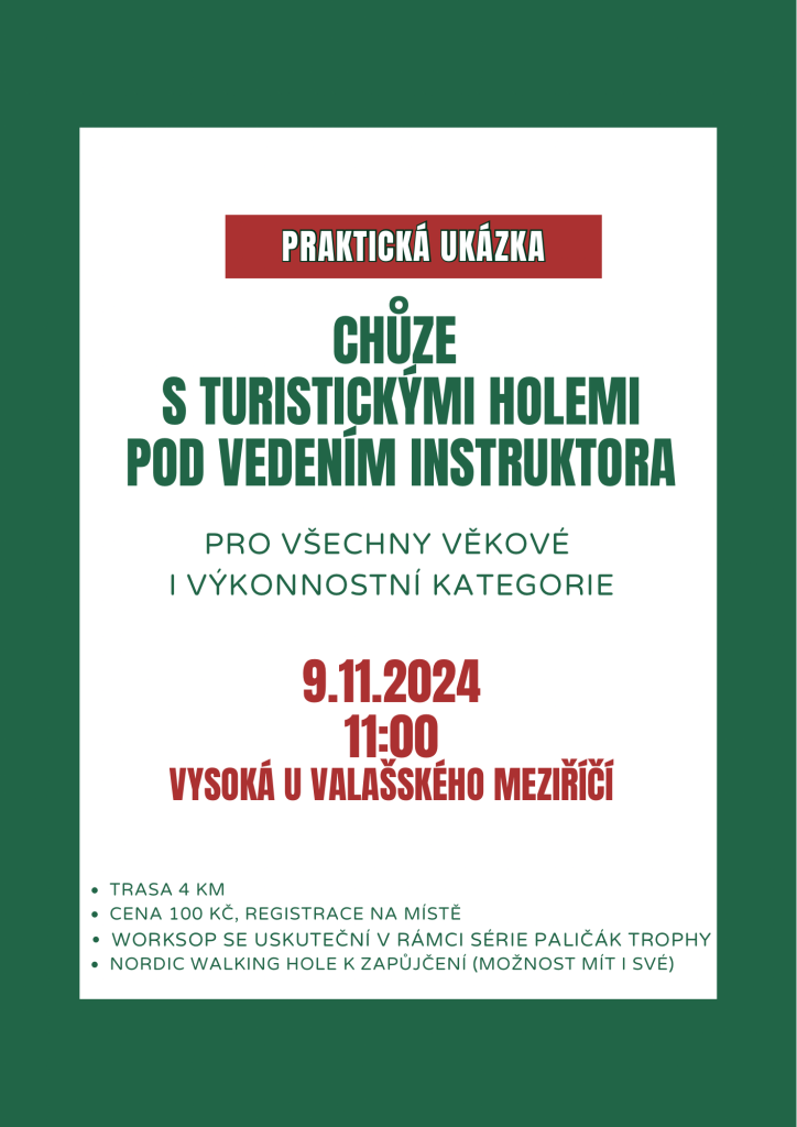 4. Milí spoluobčané, v sobotu 9. listopadu se ve Vysoké u Val. Meziříčí uskuteční Svatomartinský běh. Závod je určen pro výkonnostní a rekreační běžce i turisty. V rámci workshopu bude možné si od 11 hodin vyzkoušet chůzi s trekovými holemi pod dohledem instruktora, hole lze na místě zapůjčit. Součástí budou i závody pro děti od 2-15 let, na každé dítě čeká odměna a možnost jízdy na poníkovi. Start akce bude v 10 hodin v kulturním domě, zajištěno je bohaté občerstvení, pivo Paličák, stánek s kávou a doprovodný program pro sportovce i fanoušky. Těší se na vás pořadatelé.