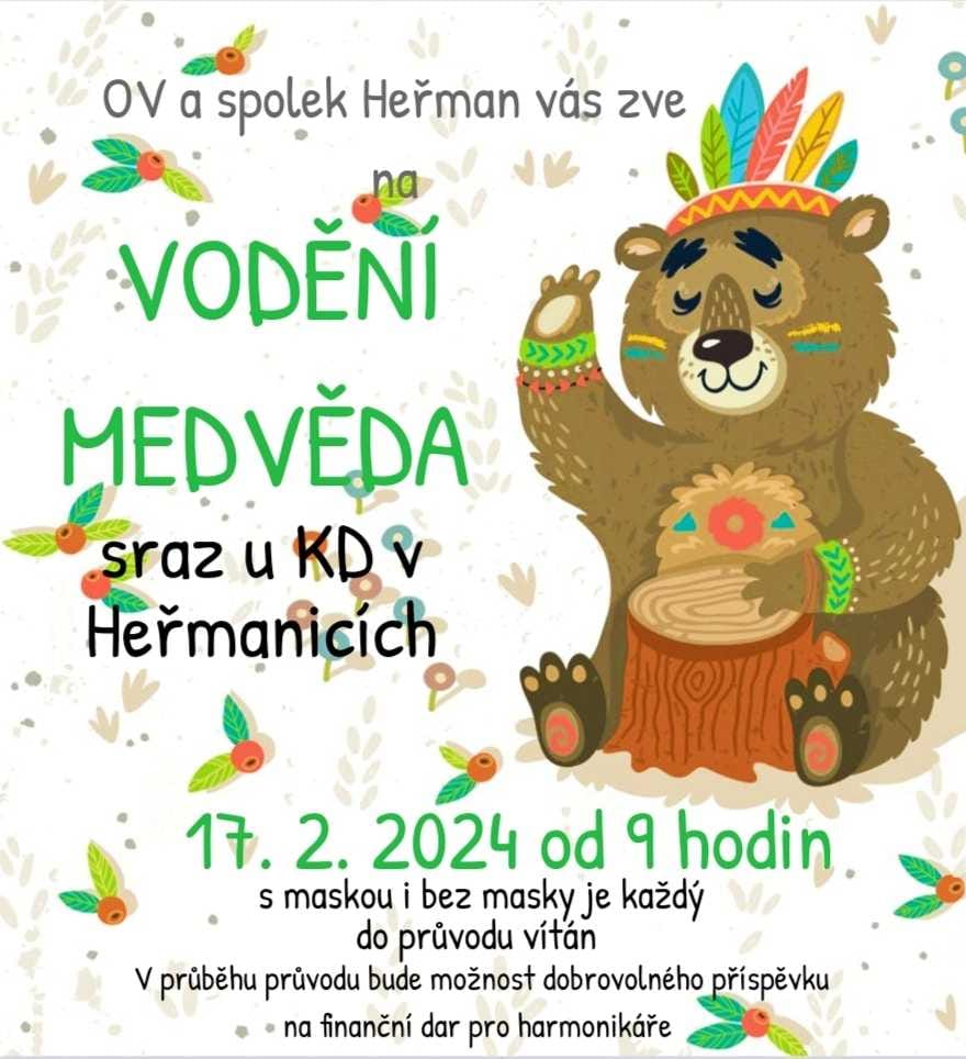 - Osadní výbor Heřmanice a spolek Heřman Vás srdečně zvou na Vodění medvěda v sobotu 17. února od 9 hodin. Sraz průvodu bude u kulturního domu v Heřmanicích. Přijďte v masce či bez masky, do průvodu jsou vítáni všichni.