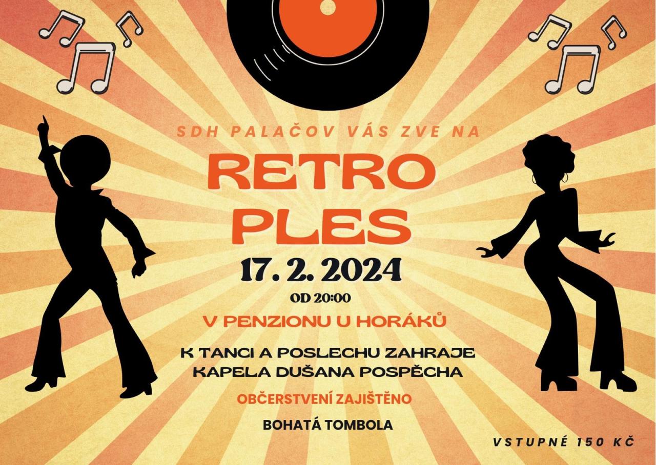 - SDH Palačov vás srdečně zve na Retro ples, který se uskuteční v sobotu 17. února od 20 hodin v sále penzionu u Horáků. K tanci a poslechu zahraje kapela Dušana Pospěcha. Občerstvení i bohatá tombola zajištěny.