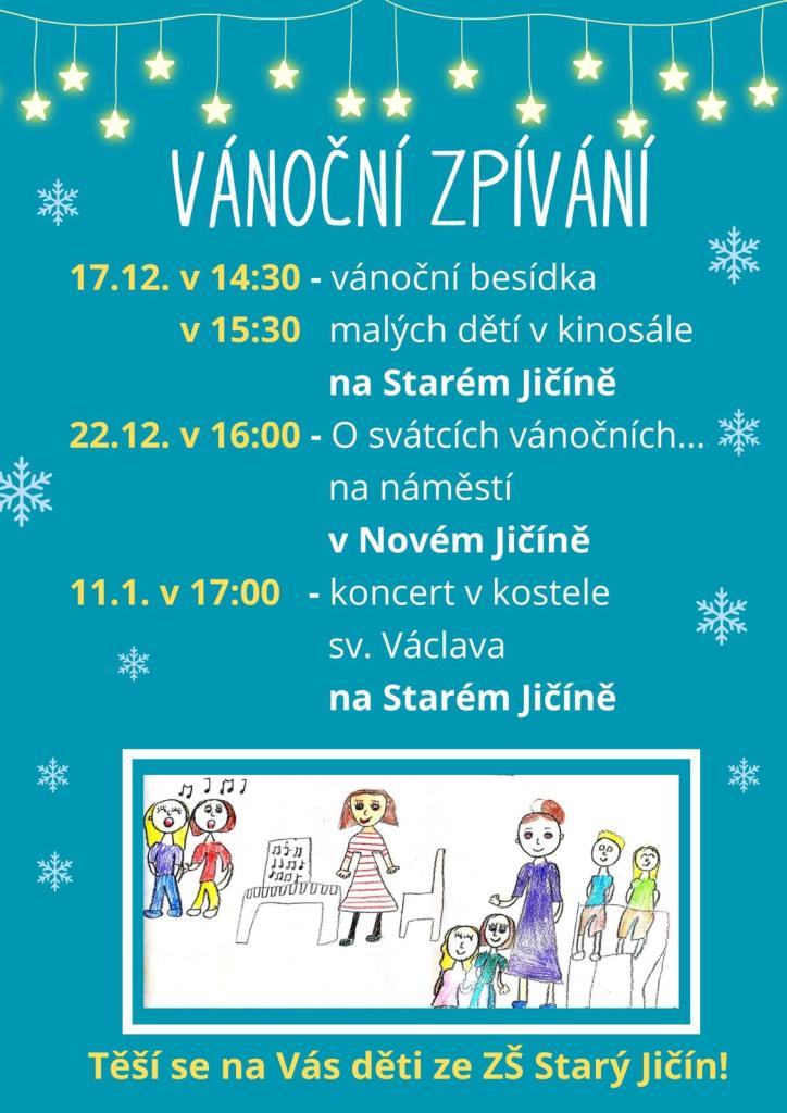 - Děti ze základní školy Starý Jičín vás srdečně zvou na Vánoční zpívání. Ve středu 17. prosince se uskuteční vánoční besídka malých dětí v kinosále staré školy na Starém Jičíně, a to ve 14:30 a v 15:30.