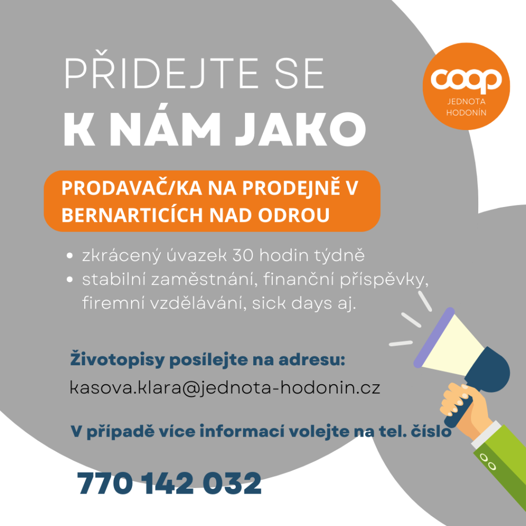 - COOP Jednota Hodonín hledá pro svou prodejnu v Bernarticích nad Odrou prodavače/prodavačku na zkrácený úvazek. Informace přímo na prodejně nebo na telefonním čísle 518 389 269, případně můžete navštívit i webové stránky www.jednota-hodonin.cz/nabidka-prace.