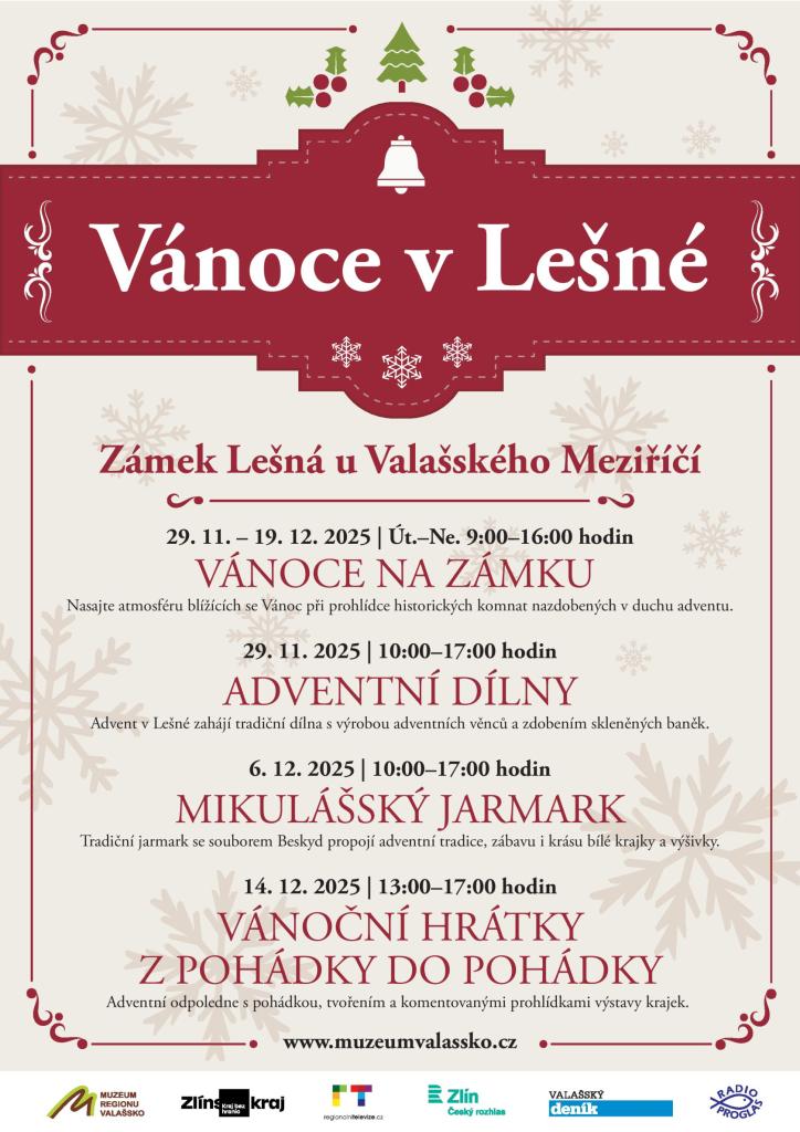 - Muzeum regionu Valašsko Vás srdečně zve do zámku Lešná u Valašského Meziříčí na oblíbené Adventní dílny s výrobou vánočních věnců a zdobením baněk. Budete si moci projít historické interiéry vyzdobené baňkami a tradičními krajkami. Vystoupí sbor ZUŠ Alfréda Radoka. Akce proběhne v sobotu 29. listopadu od 10 do 17 hodin.