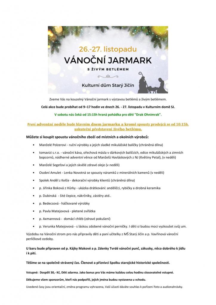 1) Spolek Starojická historická společnost vás srdečně zve na vánoční jarmark s živým betlémem, který se bude konat o víkendu 26.-27.11. od 9-17 h v prostorách KD Starý Jičín. V sobotu vás od 15 h čeká hraná pohádka pro děti Drak Ohnimrak a hlavním jarmarečním dnem bude první adventní neděle, kdy se můžete těšit na spoustu prodejních stánků a v 10 h dopoledne na živý betlém. V každou celou hodinu bude probíhat slosování vstupného. Přijďte nasát první závan vánoční atmosféry.