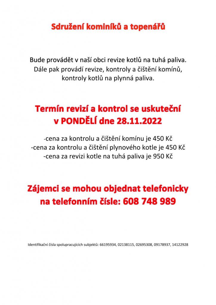3) Sdružení kominíků a topenářů bude provádět v naší obci v pondělí 28.11. revize kotlů na tuhá paliva. Dále pak provádí revize, kontroly a čištění komínů, kontroly kotlů na plynná paliva. Cena za kontrolu a čištění komínu je 450, Kč, cena za kontrolu a čištění plynového kotle je od 450,- Kč, cena za revizi kotle na tuhá paliva je 950,- Kč. Zájemci se mohou objednat telefonicky na telefonním čísle 608 748 989.