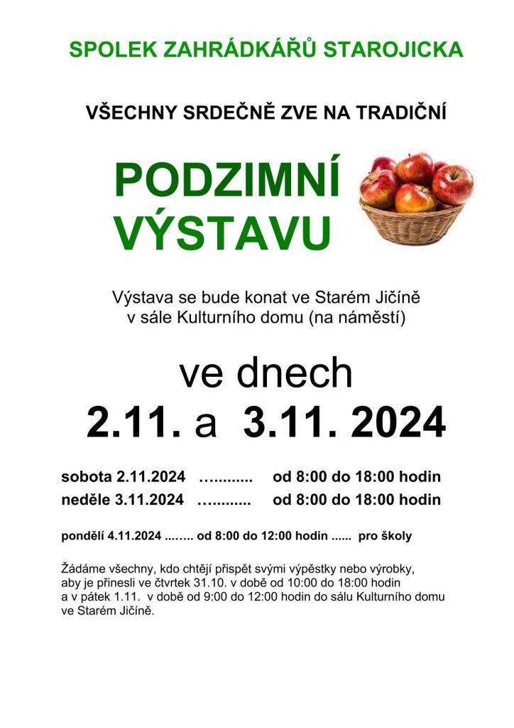 - Spolek zahrádkářů Starojicka srdečně zve na tradiční podzimní výstavu, která se bude konat v sále Kulturního domu na Starém Jičíně 2. a 3. listopadu. Otevřeno bude vždy od 8 do 18 hodin. Žádáme všechny, kdo chtějí přispět svými výpěstky či výrobky, aby je přinesli ve čtvrtek 31. října od 10 do 18 hodin a v pátek 1. listopadu od 9 do 12 hodin do kulturního domu. Těšíme se na vás.