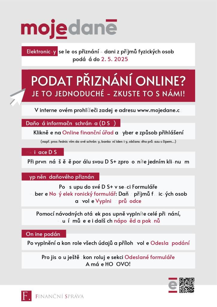 Kompletní informace, související s podáním přiznání k dani z příjmů fyzických osob za rok 2024, jsou uvedeny na webu Finanční správy ČR, například zde a zde. Osobní návštěva úřadu tak není nutná.