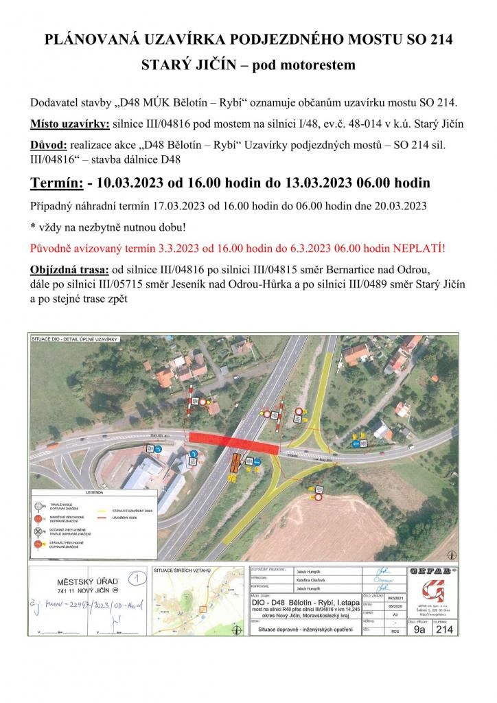 Plánovaná uzavírka podjezdného mostu SO 214 - Starý Jičín pod motorestem