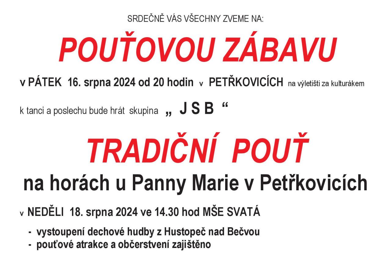 16. 8. – 20. 08. – Tento víkend bude v prvé řadě věnován tradiční pouti v Petřkovicích. Ta začne v pátek 16. 8. od 20 hodin Pouťovou zábavou na výletišti u KD. V neděli 18. 8. ve 14:30 pak proběhne mše svatá na horách u Panny Marie Lourdské, po které se můžete těšit také na pouťové atrakce či vystoupení dechové hudby z Hustopeč nad Bečvou.