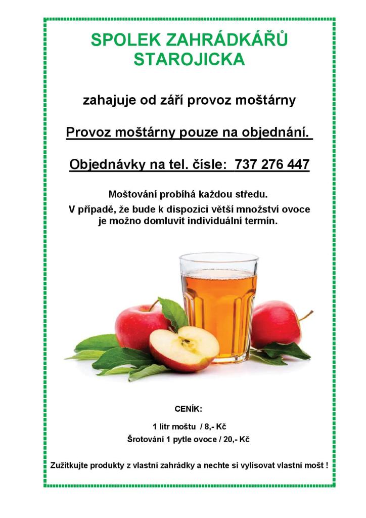 Připomínáme provoz moštárny na Starém Jičíně. Objednávky lze provádět na tel. čísle: 737 276 447.