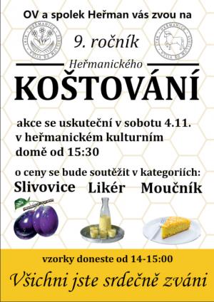 Heřmanické koštování — soutěž v kategoriích Slivovice, Likér a Moučník.