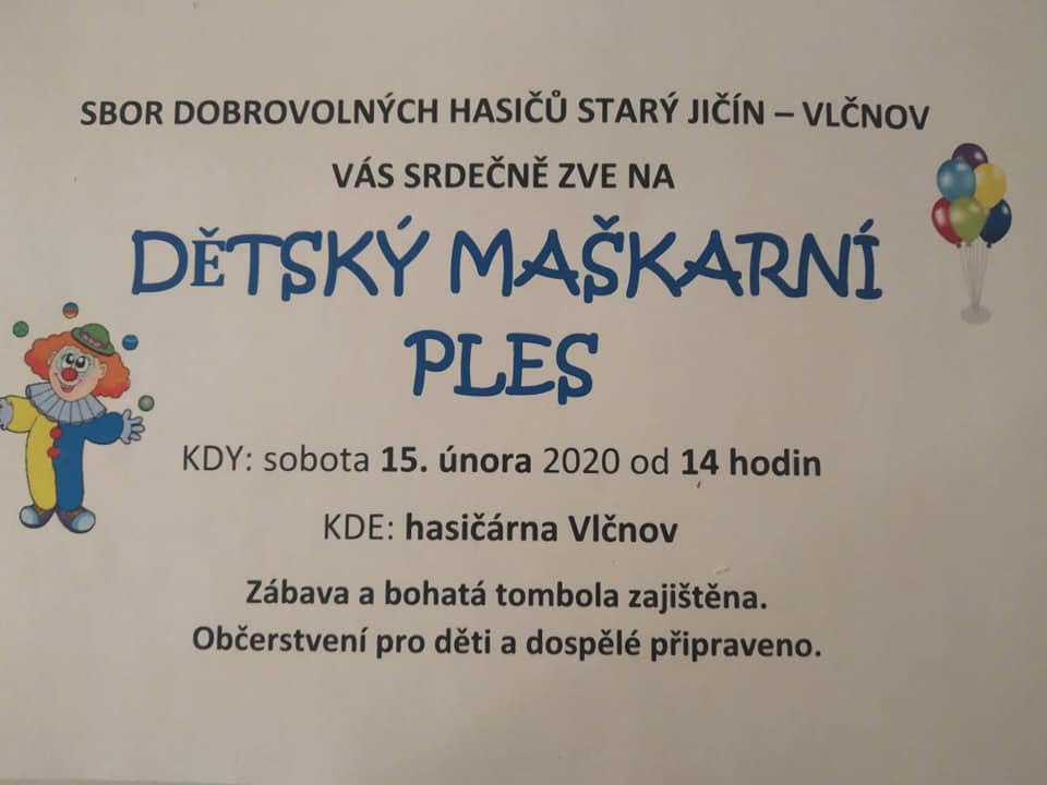 Dětský maškarní ples - 15.2.2020 od 14 h v hasičárně ve Vlčnově